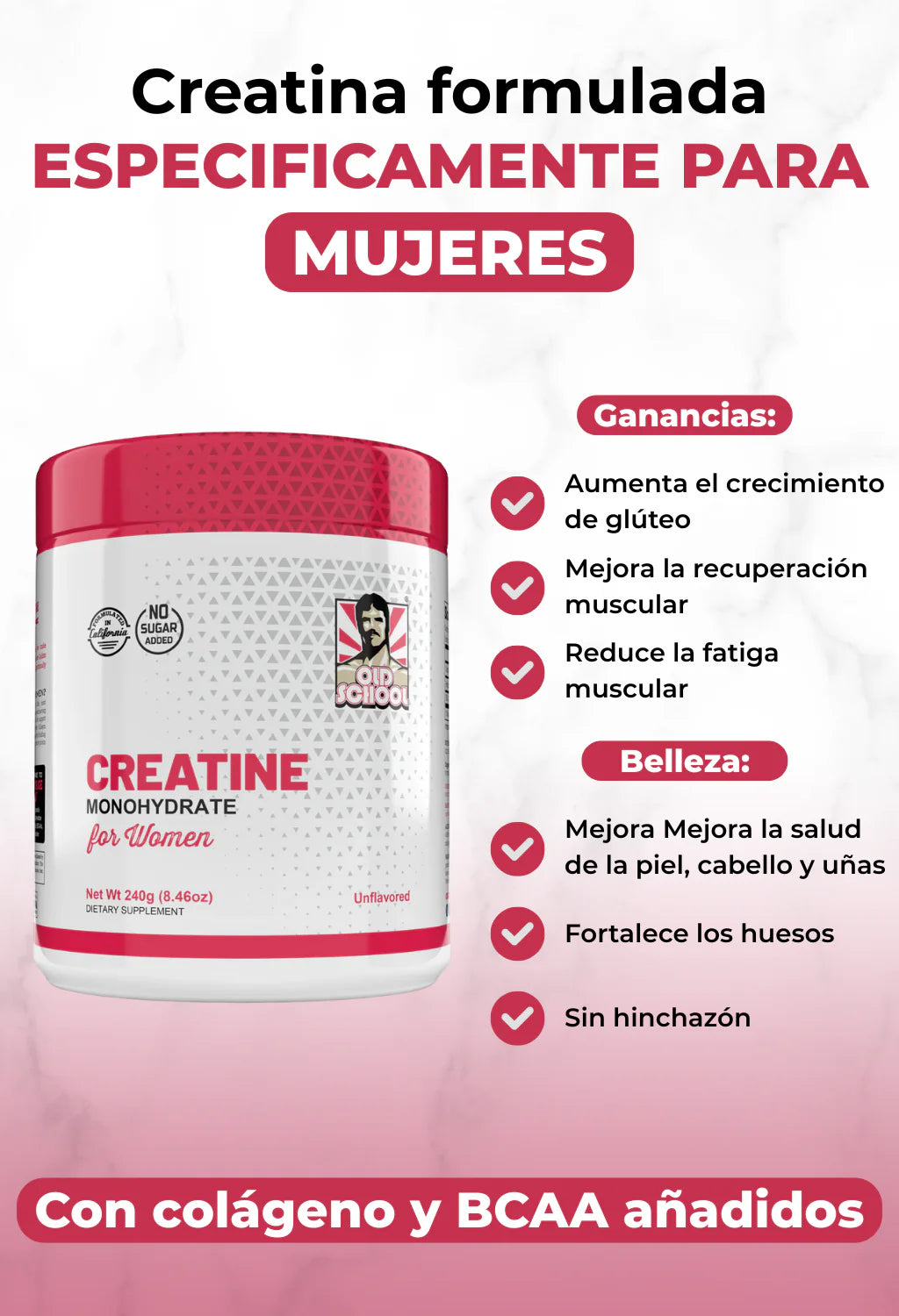 Entrenas juiciosa pero el progreso se frena. Con la creatina Old School Labs 3-en-1 (creatina, BCAA y colágeno), subes repeticiones y te recuperas mejor para ver avances visibles en glúteos y muslos.